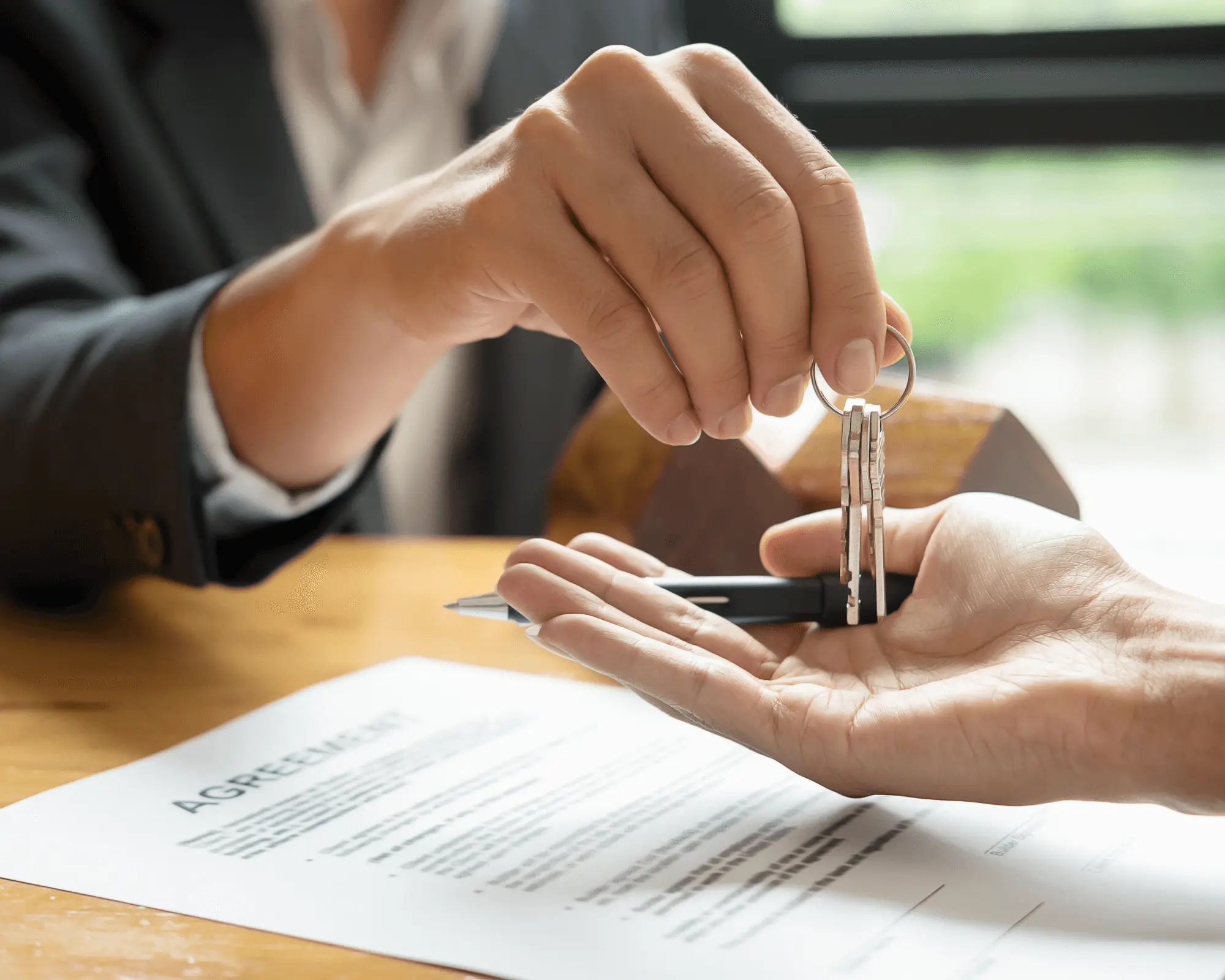 propriétaire d'un bien immobilier en train de tendre ses mains dans lesquelles se trouvent une maison miniature et les clés de celle-ci au-dessus d'un contrat en papier et d'un stylo