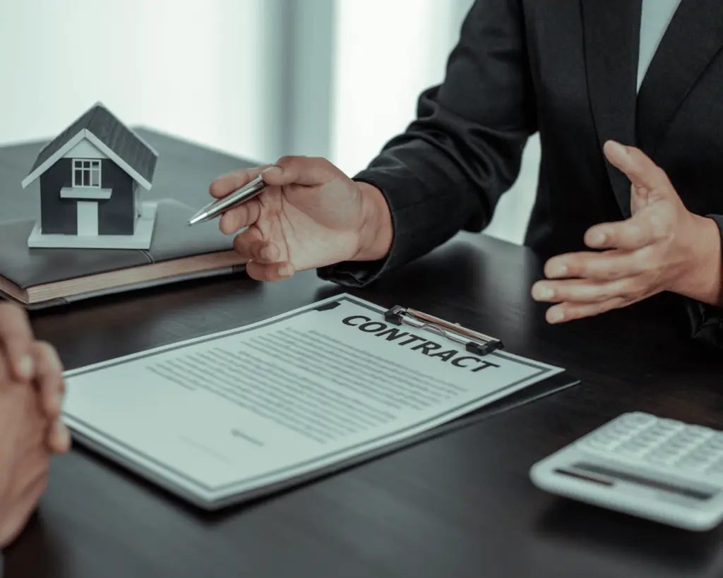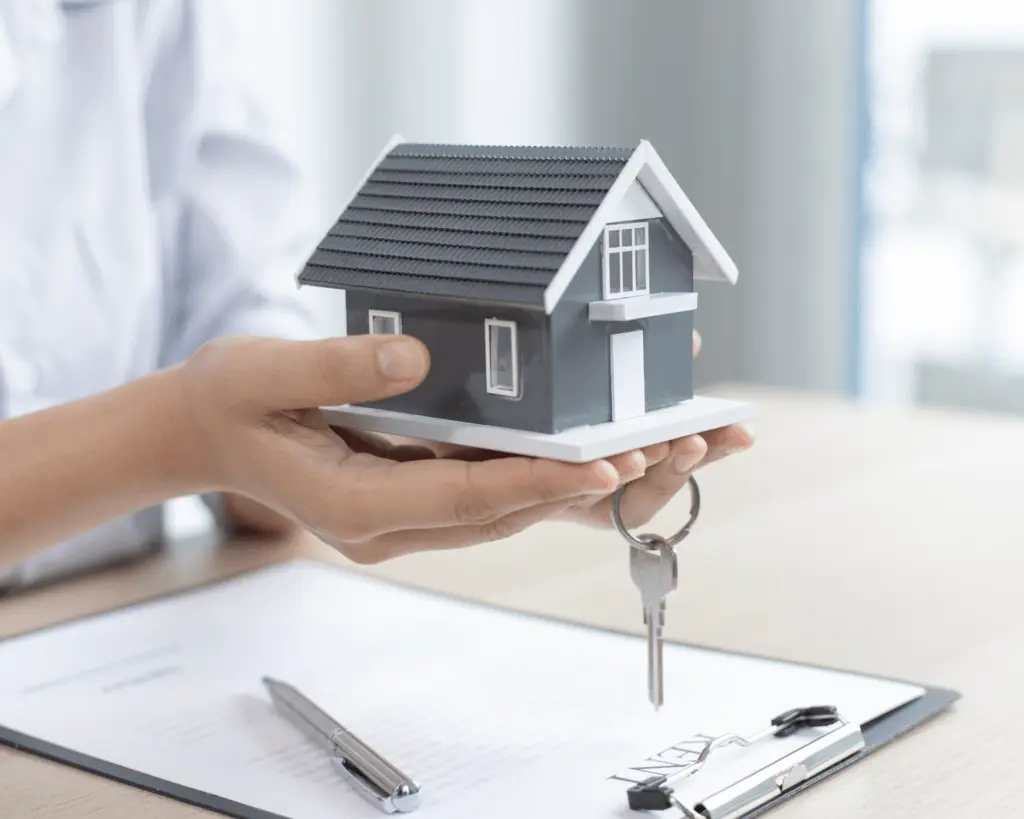 propriétaire d'un bien immobilier en train de tendre ses mains dans lesquelles se trouvent une maison miniature et les clés de celle-ci au-dessus d'un contrat en papier et d'un stylo