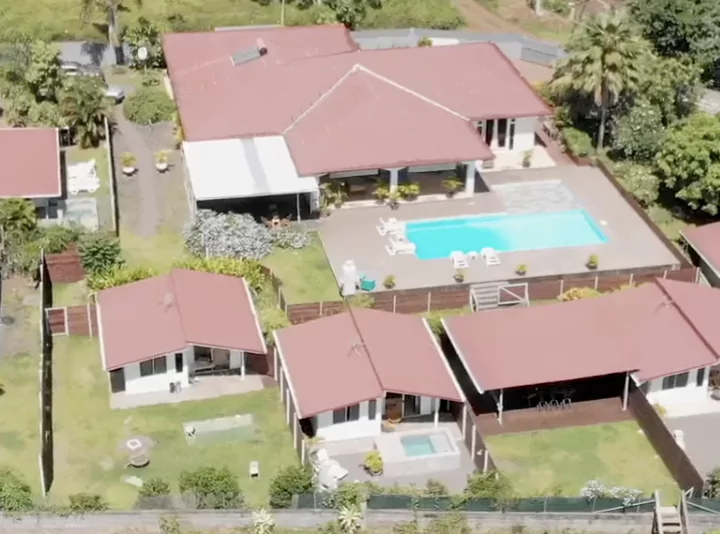 TAHITI / PRESQU’ILE… VENDS LODGE COMPOSE D’UNE VILLA PRINCIPALE ET DE 6 BUNGALOWS INDIVIDUELS SUR TERRAIN DE 3425 M², PISCINES, VUE MER…